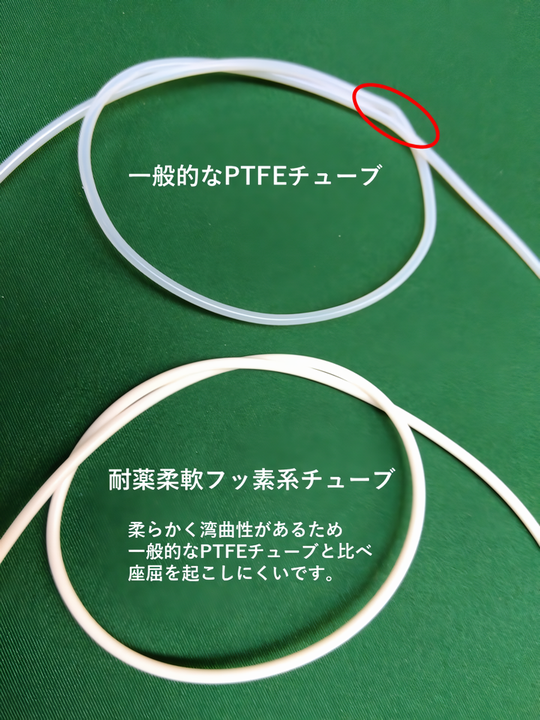 従来のフッ素樹脂チューブではあり得ない湾曲性があり、耐薬品性、耐熱性に優れた製品です。