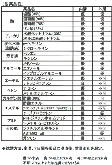 - ・内層は4フッ化系樹脂、殆どの薬品に耐性があります。